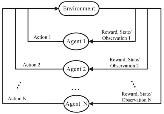 The control problem of multiple UAVs belongs to multiagent reinforcement learning [19,20]. Each UAV is an agent and needs to be defined according to the quintuple. The structure of its interaction with the environment is shown in Figure 1: