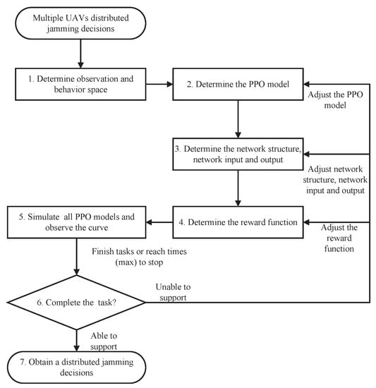 As shown in the flowchart in Figure 3, a new effective model is obtained based on the IPPO learning algorithm for distributed jamming decisions for multiple UAVs.