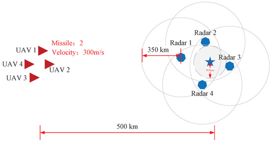 In the simulated domain scenario, both sides of the electromagnetic countermeasure scenario are modeled. Assuming that the multiple UAVs are Red, they mainly attack the hostile radar station (training side); the hostile radar station is Blue, which acts as the defensive side (accompanying side) in the simulation scenario. As shown in Figure 4, Blue deployed a total of 4 radar stations, and each radar station is equipped with an air defense position, which can defend a circular area with a radius of 350 km. The four radar stations are distributed around the command and provide dead-end detection of the surrounding area. Red has a total of 4 UAVs in stock, starting the incursion from 500 km from the hostile radar. Each UAV is equipped with passive detection equipment and radar jamming equipment, but the UAV can only activate one function at the same moment due to its real physical properties. That is, the radar position detection and radar signal jamming possessed by the UAV are mutually exclusive behaviors.