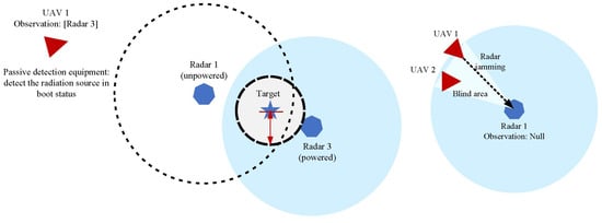 As shown in Figure 5, when the UAV is in the perceptual (detection) state, it can obtain the coordinate information of the Blue ground radar through the passive detection equipment it carries. However, due to the influence of the working model of passive detection equipment, UAVs can only detect the radar information that is currently in the boot state. The unpowered radar does not have a radiation source, so it cannot be detected by the UAV.