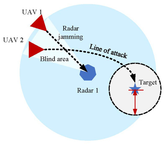 When the UAV is in a radar jamming state, it exerts an oppressive jamming effect on the detection signal of the hostile radar through the jamming equipment it carries. In the circular detection area of hostile radar, a sector detection blind area is created. In this sector blind area, Red will not be detected by radar. Due to the directionality of the electromagnetic wave emitted by radar jamming, the UAV can only play a role in jamming hostile radar within a certain range.