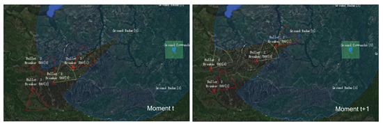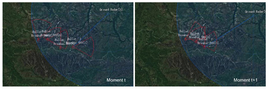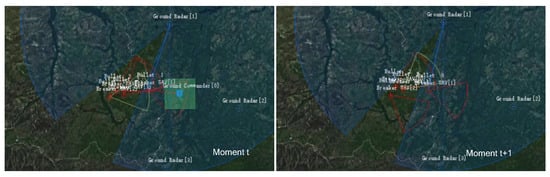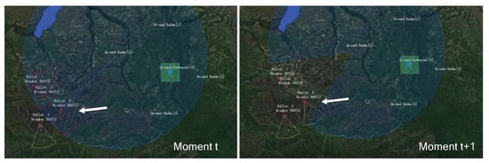 By the 5000th epoch of training, the UAVs have learned to avoid being locked by radar and destroyed by turning on their jamming radar to cause a Blue radar information gap. As shown in Figure 10, the UAV is locked by the radar at moment t. At moment , the UAV can unlock itself from the Blue radar by turning on its own jamming radar to cause a gap in the Blue radar scan. By adjusting the operating mode of their radar to avoid being destroyed, they can obtain a negative reward value. As can be seen from Figure 8, the reward function score increases at the 5000th epoch.