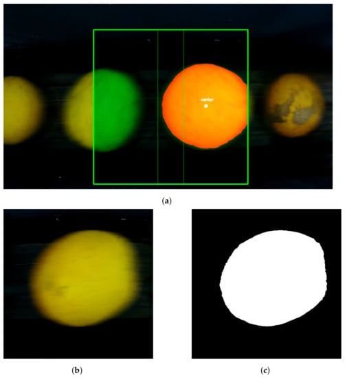 Individual frames and segmentation of an individual citrus fruit inside the ROI and its corresponding mask. (a) Individual frame of a citrus fruit inside the ROI, intersecting the vertical references; (b) isolated centered citrus image with motion blur; (c) segmented region of a citrus fruit with motion blur.
