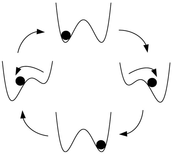 When and , the noise is introduced, and as D continues to increase to a certain value, the noise, the periodic drive signal and the bistable system achieve a synergistic effect. The protons are excited by the noise energy to overcome the potential barrier between the two stable points; the transition frequency depends on the frequency of the potential function flipping and twisting. Thus, the energy of the noise will accompany the proton transition, showing an output state with the same frequency as the periodic driving signal, and thus the randomness of the noise is suppressed and transformed into a periodic output, which enhances the periodic signal and improves the output signal-to-noise ratio. The proton stochastic resonance transition model of a nonlinear system is shown in Figure 2.