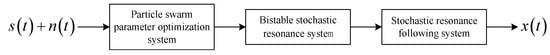 From Formula (22), it can be seen that the time interval of signal sampling points after re-sampling is R times that of the original, which is equivalent to reducing the frequency of the signal to the original . Thus, it is only necessary to select an appropriate R to achieve stochastic resonance of high-frequency signal detection. In practical engineering, the frequency component of the detected signal is usually unknown, so it is not feasible to use the signal-to-noise ratio as the evaluation index of the stochastic resonance detection effect. The cross-correlation coefficient between the input signal and the output signal of the bistable system reflects the phase matching degree of the input and output signals and has no requirement for the signal components. It is an ideal parameter for evaluating the effect of stochastic resonance detection in practical engineering. Taking the cross-correlation coefficient between the input and output of the bistable system as the objective function of system parameter optimization, various optimization algorithms can be used to find the system parameters a and b that lead to the best detection effect. The algorithm model used in paper [27] is shown in Figure 3.