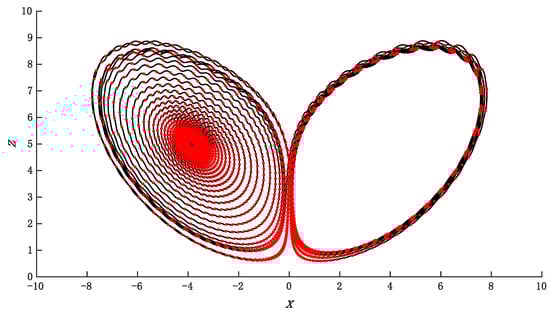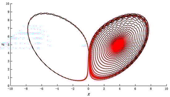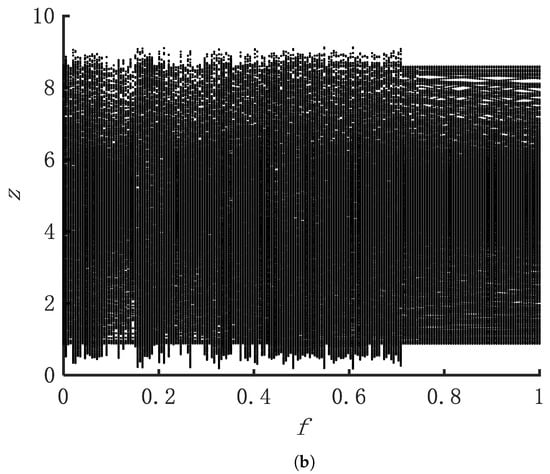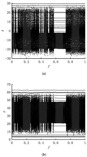 Under the condition that the system parameters are set to and the initial values are set to , the bifurcation diagram of the system state variables x and z changing with the control signal amplitude f is shown in Figure 5.