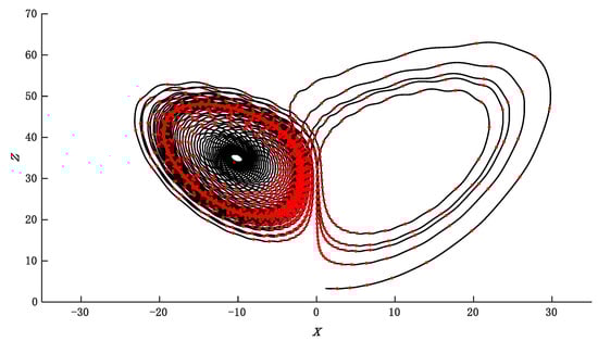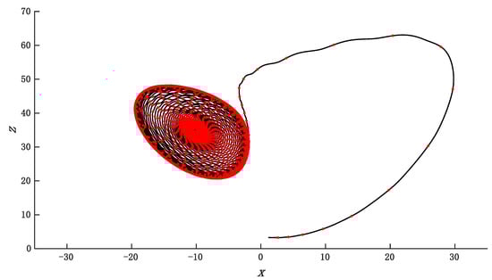It can be seen from Figure 8 that the Chen system does not have a large-period state and the system state is composed of countless different chaotic states. The bifurcation diagram of the system state variables x and z has a flat envelope area. The difference from the Yang system is that the flat envelope of the Chen system is the persistent region and the flat envelope of the Yang system is the locality region. The threshold value of the control signal’s periodic component for the Chen system to enter the flat envelope region is (0.65,0.75). The critical amplitude of the control signal’s periodic component for the Chen system is 0.7014001824, which is determined through a dichotomy test. Therefore, the Chen system can generally provide a amplitude detection accuracy in a noise-free environment; that is, the Chen system has a phase trajectory that is significantly different to the critical state when the amplitude of the control signal’s periodic component is 0.7014001825. The chaotic critical state of the Chen system and the phase trajectory and attractor distribution after entering the flat envelope are shown in Figure 9 and Figure 10, where the red dots in the figure are attractors.