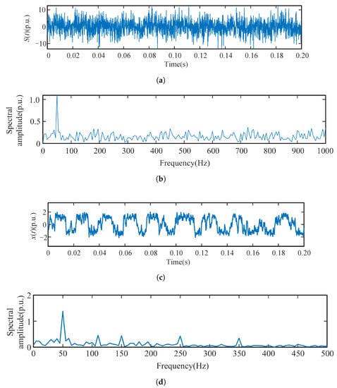 Today’s power systems are constantly developing towards the creation of an integrated energy system and smart grid. With increasing amounts of new energy nodes, investments in power electronic equipment and the continuous improvement in voltage levels, power system electromagnetic environments are becoming increasingly complex, making power system fault signal detection increasingly difficult. At the same time, as the scale of the AC/DC hybrid power grid and the number of distributed micro-grids continue to increase, the difficulty of maintaining stable system operation also increases. Extreme weather and technical emergencies are more likely to affect the stable operation of the system. Emergency decision-making systems for microgrids and emergency energy management strategies for AC/DC microgrids have been studied in the literature [1,2]. Usually, these emergency management strategies are required to accurately identify the types and degrees of system faults in order to achieve effectiveness. However, the electromagnetic environment in faulty large-scale power grids is extremely complex, and many fault feature signals are engulfed in strong background noise. Accurately extracting fault feature signals poses great difficulties. Among traditional time–frequency domain signal processing methods, such as the discrete Fourier transform, modal decomposition, matrix beams, singular value decomposition, etc. [3,4,5,6], the lowest detectable environmental signal-to-noise ratio is only −20 dB. Therefore, an efficient and accurate weak signal detection method is urgently needed in the fields of harmonic monitoring, low-frequency oscillation identification, motor fault diagnosis and fault location.