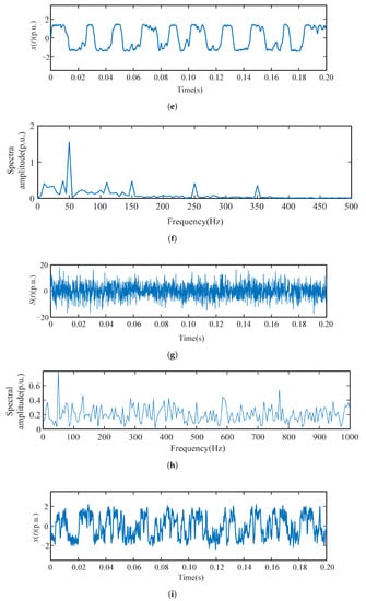 In order to compare the chaos method with the classical time–frequency domain method, the weak harmonic signal of a power system from the literature is used () for simulation. The angular frequency and the fundamental frequency component frequency .