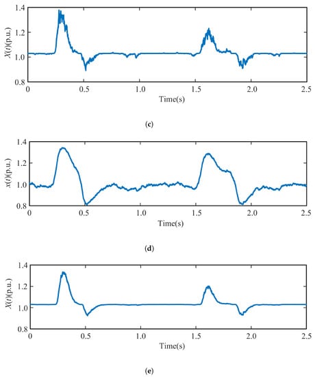 Experimental results of DC transmission line voltage fluctuation detection. (a) Original input signal; (b) Bistable system stochastic resonance output signal; (c) Stochastic resonance follows the system output signal; (d) Stochastic resonance output signal of the two-stage cascaded bistable system; (e) Two-level cascaded stochastic resonance follows the output signal of the system.