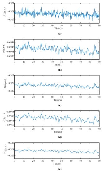 The rotational speed of the generator rotor is an important parameter in the analysis of the safety and stability of a power system. Abnormal fluctuations in the rotor rotational speed should be detected in time and the cause should be checked. The difference curve between the motor rotational speed and the rated rotational speed collected by the motor control center of the unit in a certain period of time is determined. As an experimental signal, the rotational speed is calculated as a per unit value, with 100 r/s as the reference value. Due to performance limitations of the inertial sensor that monitors the rotational speed and the strong magnetic interference of the generator’s operating environment, the original signal data are engulfed in strong background noise. The adaptive single-trap stochastic resonance method based on the particle swarm algorithm was used to test the collected rotational speed signal. After iterative optimization, the optimal system parameters were a = 0.611 and b = 0.032, the optimal sub-sampling compression ratio was R = 7.48 and the input–output correlation coefficient corresponding to the optimal parameters was 0.99848. The experimental results are shown in Figure 13.