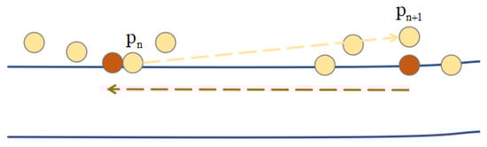 Figure 2 and Figure 3 show two examples to illuminate how we determine the direction of a running bus. In these two figures, the red dots represent bus stops, the yellow dots represent GPS points, and the direction from left to right is uplink. It can be seen that the vector angle of the bus GPS and the stop pair in Figure 2 is within the threshold range. Thus, it can be determined that the bus running direction is the same as the stop direction, and is uplink. Different from Figure 2, the vector angle between the bus GPS and the stop pair in Figure 3 is not within the threshold range. Thus, it can be determined that the direction of the bus is opposite to the direction of the stop pair, and is downlink.