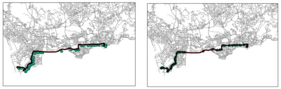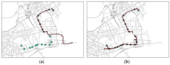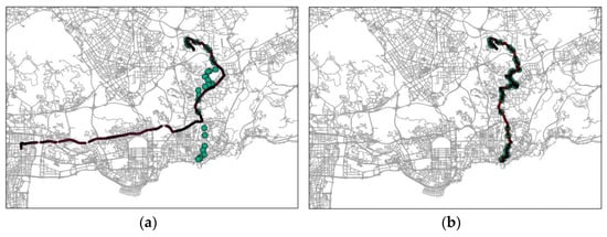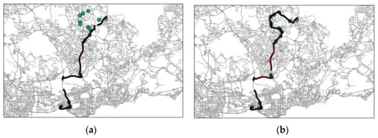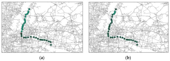 Figure 9 depicts the result of the detection for a Guangzhou bus, and the bus’s identity is xxx672 (we replaced the partial identity with xxx to protect data privacy). In this figure, the background layer is the urban road network, the green circles represent bus stops, and the red circles stand for an actual bus trajectory.