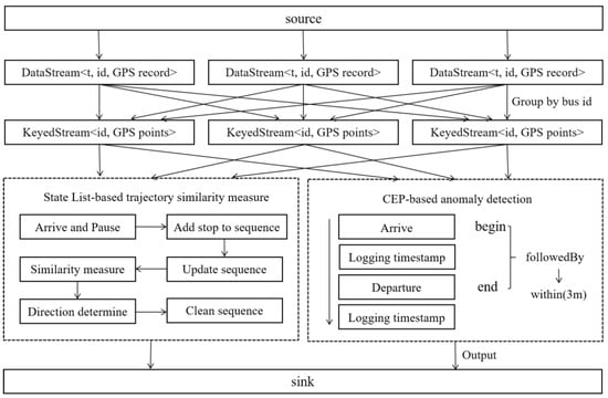 In this workflow, two key technical points need to be further discussed, the first is the state management mechanism (SMM) and the second is the Complex Event Processing (CEP). SMM is used to save and update a bus’s actual trajectory, which deviated from the raw GPS trajectory and was maintained as a stop sequence. CEP is used to detect bus arrival, departure, and pattern events. As a bus is running on the trip, the stop represented trajectory changes over time. When the CEP determines to add a stop to the sequence, it obtains the sequence from SMM according to the bus identity, adds the stop to the sequence, and saves the new stop sequence to SMM. SMM and CEP cooperate with each other, jointly, completing the major steps. In addition, a group of long-time running tasks is used to implement the pipeline of anomaly detection in a parallel way.
