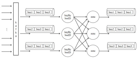 Step 1: A group of tasks simultaneously retrieve GPS records from Kafka, and then the operator keyBy() is applied to divide all points into different groups according to the bus identity. Within each group, it sorts points by time and generates a trajectory for each bus.