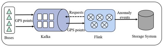 Figure 5 shows the detection framework, which consists of two big data components, the message middleware called Kafka, and the streaming processing engine named Flink. Kafka receives GPS positioning records transmitted from buses and notifies a group of tasks launched by Flink to retrieve these records. Flink is in charge of a group of long-time running tasks to implement anomaly detection for continuously generated GPS trajectories.