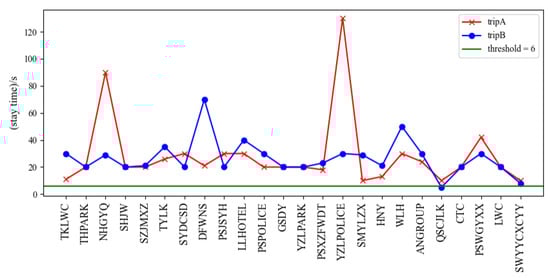 Figure 13 shows the stay times for all stops in a designated route. There are two trips produced by the same bus with identity BS350xxx. The red curve represents tripA, and the blue curve represents tripB. The green horizontal line stands for the time threshold with a value of six seconds. The x-axis stands for the stop sequence of the designated route, each label in x-axis is a bus stop. The y-axis is time cost, which represents the time it takes for a bus to pass a stop.