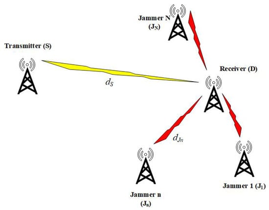 As shown in Figure 1, the jammers are denoted as , the distance between S and D is and the distance between and D is . There are M channels that S can use to communicate with D. The set of all usable channels is denoted by . The set of usable transmission powers at S is represented by , and the set of usable jamming powers can be written as , where and are the number of the transmission power levels and the interference power levels, respectively. During the electronic countermeasures process, S and the jammers can adjust their strategies including the communication/jamming channel and the transmit/jamming power.