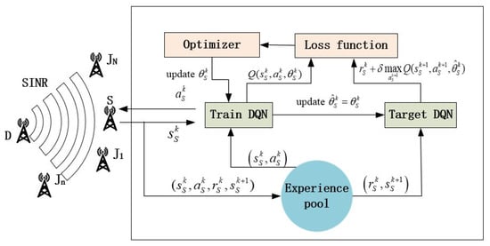 A similar DQN algorithm is also performed at . In the k-th time slot, the agent of obtains its state, which is responsible for describing the local environment. Then, each jamming agent individually chooses an action according to the local information, known as state, and they execute in parallel. The only difference is that all the jamming agents calculate a common reward by using the feedback SINR of D as well as the jamming powers shared among the jammers. The DQN algorithm of each jamming agent is the same as shown in Figure 2, and we will not describe it again. The process of the proposed DQN-based scheme is shown in Algorithm 1.