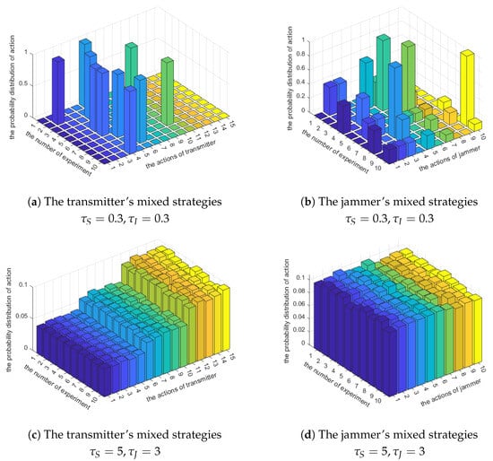 Figure 3 gives more insights on the influence of the parameters and . The mixed strategies of S and the jammers with different values of and are shown in the figure. The results show that when and are small, for example, and , the HL-based scheme tends to favor deterministic strategies, indicating that the probability of a certain action is equal to or close to 1 while probabilities of other actions are close to 0. However, when the parameters are larger, such as and , the probability distribution of actions tends to become a uniform distribution, indicating that the mixed strategies obtained by the HL-based scheme become similar to the random strategy. These observations of the HL-based scheme can be explained as follows. When and are small, the effect of feedback on the mixed strategies is amplified, leading the HL-based scheme to exploit existing strategies more than exploration of the environment. When and are large, the effect of feedback on the strategies decreases and results in exploring new action more than exploiting the known information.