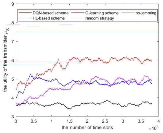 Figure 5 illustrates the transmitter’s utility of different anti-jamming schemes for a single jammer case. The “no-jamming” line represents the maximum utility of the communication system when there is no jamming. As shown in the figure, the DQN-based scheme has the highest utility value among the anti-jamming communication schemes. The utility of the HL-based scheme is higher than that of the commonly used random strategy. Compared with the Q-learning scheme, the HL-based scheme achieves comparable utilities as the Q-learning scheme but has a much faster convergence speed. The HL-based scheme converges after time slots, while the Q-learning scheme does not reach convergence until after the th time slot. The reason is that the size of the Q-value table of the HL-based scheme is only related to the number of the actions that can be used, while the size of the Q-value table of the Q-learning scheme is not only related to the number of possible actions but also related to the state space, which results in a much larger Q-value table than the HL-based scheme and a slower convergence speed.