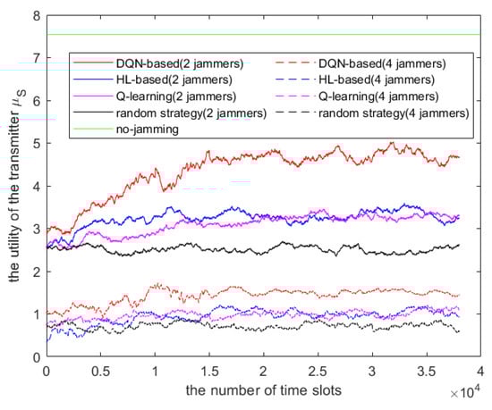 The transmitter’s utilities of different anti-jamming communication schemes with two and four jammers are shown in Figure 6. Similar to the case of a single jammer, among the anti-jamming communication schemes, the random strategy has the smallest utility, the DQN-based scheme has the largest utility and the HL-based scheme has the fastest convergence. In addition, as the number of jammers increases, the transmitter’s utility decreases for all the schemes. This is because more smart jammers have better jamming capabilities to decrease the transmitter’s utility.