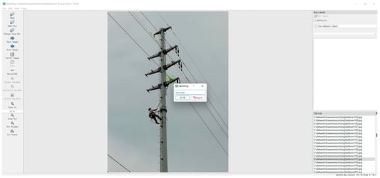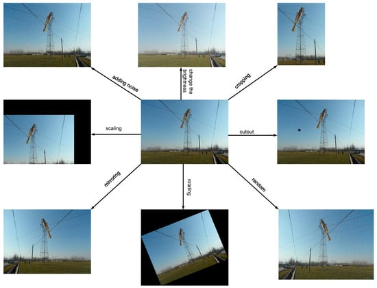 Due to the absence of a publicly available dataset specifically tailored for foreign object detection on high-voltage transmission lines, this paper undertook the creation of a bespoke dataset. Through the search engines Bing, Google, and Baidu, 1028 images in four different categories were obtained: 239 nests, 355 kites, 239 balloons, and 195 plastics. Figure 1 shows some of the images in the dataset. Label calibration was performed using labeling, as illustrated in Figure 2, which depicts the dataset calibration process. To bolster the model’s robustness and mitigate the impacts of the occlusion and varying lighting conditions typical of real-world scenarios, the dataset underwent augmentation. This augmentation involves the introduction of noise, adjustments in brightness, cutout operations, rotation, cropping, scaling, and other image-enhancement techniques, as outlined in Figure 3, illustrating the dataset enhancement approach. As a result of these image enhancements, the dataset was expanded to encompass a total of 4893 images. To facilitate the dataset’s utility, it was meticulously divided into three subsets: the training set, validation set, and test set, distributed at a ratio of 8:1:1. The training set facilitated model fitting, enabling the development of the detection model. The validation set played a pivotal role in assessing the effectiveness of the model fitting, thereby guiding the optimization of hyperparameters. Ultimately, the test set served as the final arbiter, validating the model’s performance.