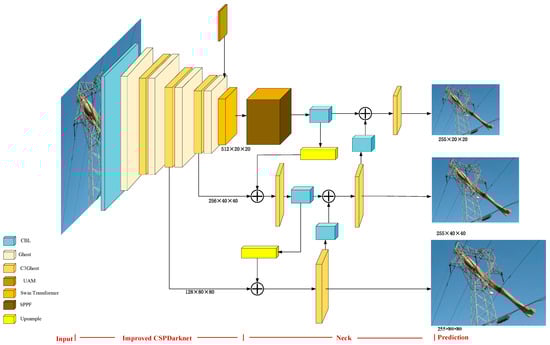 Figure 4 illustrates the architectural layout of YOLOv5-IC-ST. The structure of the YOLOv5-IC-ST network can be dissected into four fundamental components: the input layer, the improved CSPDarknet, the neck module, and the prediction mechanism. The input layer is composed of three key segments: mosaic data augmentation, image size manipulation, and a dynamic anchor frame computation. Mosaic data augmentation amalgamates four distinct images to achieve an augmented image background. For image size processing, the approach strategically appends a minimal black border to diverse original images, accommodating different dimensions, and uniformly scales them to a consistent size of 640 × 640 × 3. In the dynamic anchor frame calculation, the initial anchor frame is juxtaposed with the predicted frame output, discrepancies are quantified, and reverse updates are performed iteratively. This process iteratively refines parameters to ascertain the most suitable anchor frame value. The enhanced CSPDarknet integrates a UAM (Unified Attention Mechanism) module and a Swin Transformer module. This integration enriches the model’s ability to emphasize channel and spatial information, concurrently mitigating the influence of intricate backgrounds. The incorporation of Ghost and C3Ghost modules counteracts the expansion of weight parameters induced by the attention mechanisms. This strategy effectively reduces computational overhead while enhancing the learning efficiency of the entire convolutional neural network. Within the prediction component, feature maps of three distinct scales, (80,80), (40,40), and (20,20),2 were extracted to facilitate the detection of foreign objects on transmission lines.