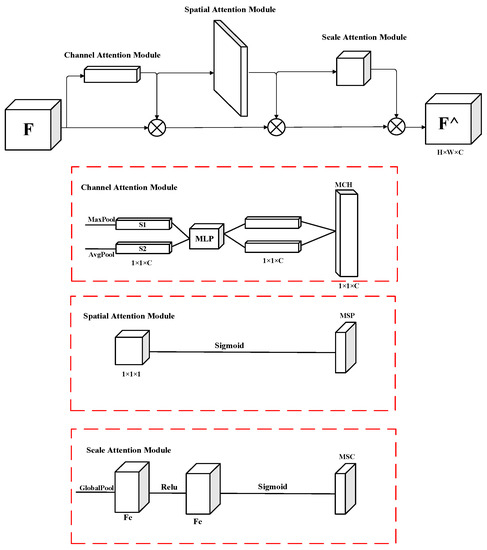 This paper introduces a novel attention mechanism termed the UAM, which synergizes the spatial attention module, channel attention module, and scale attention mechanism. Unlike other attention mechanisms [24,25,26,27], the UAM stands out by simultaneously attending to channel, spatial, and scale information. The UAM is constructed as a sequential arrangement of the channel attention module, spatial attention module, and scale attention module. The process commences with the output result of the convolutional layer traversing the channel attention module to acquire a weighted outcome. This output then proceeds through the spatial attention module and the scale attention module to ultimately yield a definitive weighted output. The specific configuration of the UAM is illustrated in Figure 5. In this context, F denotes the feature map following the convolutional layer, while H and W represent the height and width of the feature map, respectively. Furthermore, C signifies the number of channels present in the input feature map. The channel attention module’s purpose lies in compressing the feature map within the spatial dimension to generate one-dimensional vector pre-operations. In this module, the global spatial information of F undergoes compression via Max Pool and Avg Pool to engender two feature maps, denoted S1 and S2, both of which possess dimensions of 1 × 1 × C. Subsequently, two one-dimensional feature maps emerge through multilayer perception (MLP). These maps are then normalized, resulting in the creation of a weighted feature map, denoted MCH. The spatial attention module, on the other hand, compresses the channel dimension through average pooling and maximum pooling. In this module, a 1 × 1 × 1 convolutional operation activates F, and the outcome is subjected to the sigmoid function, culminating in the generation of a weighted feature map, MSP. The scale attention module begins with a global pooling step, followed by Fc, which then undergoes activation through the relu function. The output subsequently encounters another round of Fc, culminating in the final output after passing through the sigmoid activation function, yielding the weighted feature map, MSC. In a parallel arrangement, MCH, MSP, and MSC are amalgamated through element-wise summation, ultimately generating the output feature map, F^, after executing the sigmoid activation function. This intricate architecture is illustrated in a graphical representation in Figure 5.