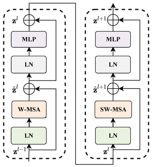 In tandem with the advancement of deep learning, the Transformer architecture has rapidly evolved within the realm of computer vision. Consequently, a growing number of Transformers have found applications across diverse computer vision tasks, such as image classification and target detection [28,29,30]. Notably, the Swin Transformer has emerged as a notable contender, adeptly homing in on the global characteristics of feature maps while maintaining a lower level of complexity [31]. The Swin Transformer module comprises several integral components, which encompass a Multi-Layer Perceptron (MLP), LayerNorm level normalization (LN), Window Multi-head Self-Attention (W-MSA), and Shifted-Window-based Multi-head Self-Attention (SW-MSA). An overview of the structure of the Swin Transformer module is presented in Figure 6. This module undertakes the bulk of global feature processing, culminating in distinct output formulations, as delineated in Equations (1) through (4), where z ^ l is the feature output of the MLP in the l module, and z ^ l is the feature output of the (S)W-MSA mechanism. z l 1 is the feature output of l 1 .