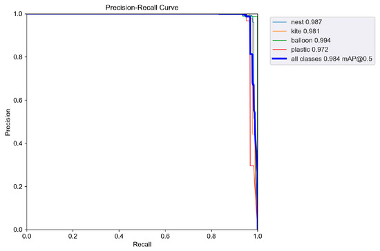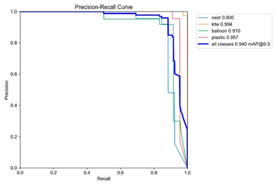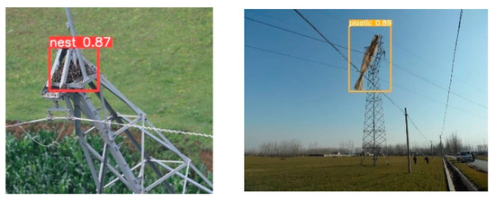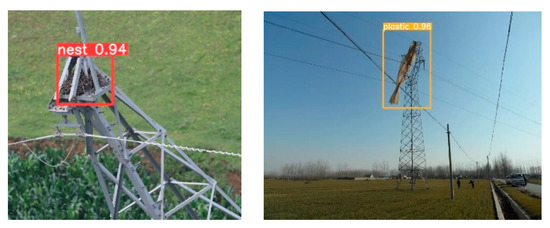 Figure 9 and Figure 10 showcase the precision–recall curve plots for YOLOv5 and YOLOv5-IC-ST, respectively. Notably, the mean average precision (mAP) for YOLOv5 amounts to 0.940, whereas the enhanced YOLOv5-IC-ST attains a superior mAP of 0.984. The mAP increased by 4.4%, fully demonstrating the effectiveness of the improvement These comparisons underscore the enhanced performance achieved by YOLOv5-IC-ST. Figure 11 and Figure 12 further depict the detection results in visuals for YOLOv5 and YOLOv5-IC-ST, respectively. The YOLOv5-IC-ST shows better localization and identification for both smaller bird nests and larger plastics. The implementation of the YOLOv5-IC-ST algorithm remarkably demonstrates its ability to precisely identify foreign objects, showcasing its robust detection capabilities. These visual representations substantiate the effectiveness of the YOLOv5-IC-ST algorithm in significantly bolstering the detection accuracy for foreign objects.
