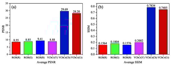The difference between low-light images and normal images in RGB space and YCbCr space under the VE-LOL dataset. (a) The average PSNR values for each channel; (b) The average SSIM values for each channel.