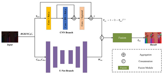 The architecture of the proposed dual-branch enhancement network (DBENet) is shown in Figure 3. DBENet consists of two branches (CNN branch and U-Net branch) and a fusion module. The network follows a divide-and-conquer strategy, where the input image is transformed from the original RGB color space to the YCbCr color space for separate processing. The CNN branch handles the luminance component (Y) based on the nonlinear function. The encoder–decoder branch network processes the chrominance component () starting from global features. Finally, the cascaded fusion features ( and ) from both branches are fed into the fusion module to aggregate the enhanced image.
