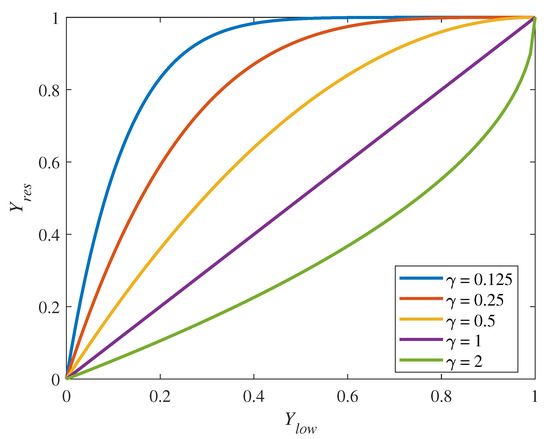 Within the CNN branch, the process begins by normalizing the image to a 0–1 range. Subsequently, the network learns the intermediate parameter gamma for predicting the mapping function and, finally, computes the predicted result. As illustrated in Figure 4’s mapping curve, when the gamma value is less than 1, it brightens areas with underexposure, while gamma values greater than 1 darken areas with overexposure. The purpose of this function is to provide reasonable suppression, allowing the control and mitigation of the local intensity increase, while simultaneously enhancing the overall image quality.