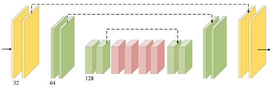 In an effort to reveal the details while avoiding the increase in distortion, we propose a chromaticity denoising module. The module uses the chrominance channel of the low-illumination image to mainly reflect the chrominance information of the image, which can be represented as W. Since the color information distortion is often non-local, in order to obtain the global color information of the image, the classical U-Net network structure is used to enrich the spatial information by extracting features of different sizes so that the semantic information is more diverse. Through the encoder–decoder structure, the U-Net branch can capture context information at different scales. In addition, the introduction of skip connections enables U-Net [39] to make full use of feature information and restore details and boundaries, as shown in Figure 5. In the U-Net branch, the encoder expands the receptive field of convolution via layer-by-layer pooling operation. In the bottleneck layer of the network, the larger receptive field can extract the non-local chrominance information for contrast recovery, and the decoder expands the non-local information to the global via layer-by-layer upsampling.