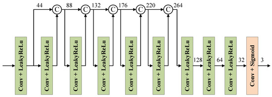 In our method, we did not perform the corresponding transformation from YCbCr to RGB color space on the returned three components. Instead, we did not design a unique fusion rule but used a fusion module to generate the fused result . As shown in Figure 6, the architecture of the fusion module consists of 10 layers, with and concatenated as inputs. Each layer has a convolutional operation, followed by an activation function. The kernel size of all convolutional layers is set to 3 × 3, with a stride of 1. The padding mode is set to “reflect” to prevent edge artifacts. No pooling layers are used to avoid information loss. The activation function in the first nine layers is LeakyReLU with a slope of 0.2, while the activation function in the last layer is Sigmoid. Furthermore, studies [40] have shown that building short connections between layers close to the input and layers close to the output can significantly deepen and effectively train neural networks. Therefore, in the first seven layers, dense connection blocks are utilized to improve information flow and performance. In these layers, shortcut direct connections are established in a feed-forward manner between each layer and all preceding layers, reducing the problem of vanishing gradients.
