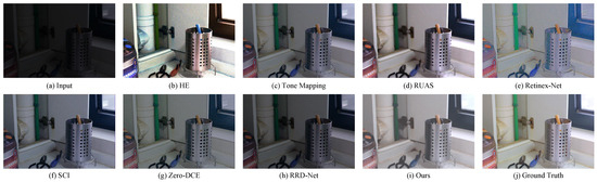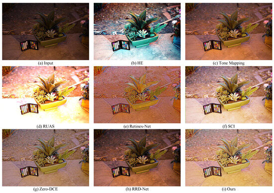 Parameter Settings: Parameter Settings: All experiments in this paper were conducted in the same configuration environment, i.e., training environment configuration: Ubuntu system, 32 GB RAM, and NVIDIA GeForce RTX3090 GPU. The network framework was constructed with the PyTorch framework and optimized using Admm [42] with parameters , , . In addition, the batch size was 16, the learning rate was 0.0002, and the training sample size was uniformly adjusted to 256 × 256. A total of 485 randomly selected paired images from the LOL dataset were used to train our model. The training epoch number was set to 3000.