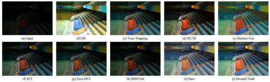 Figure 7 and Figure 8 show some representative results of the visual comparison of various algorithms. Figure 7 and Figure 8 belong to the LOL and VE-LOL datasets, respectively. In Figure 7, it can be seen that HE has obvious image distortion and color distortion; Retinex-Net amplifies inherent noise, losing image details; SCI, Zero-DCE, and RRD-Net have weak brightness enhancement capabilities; tone mapping, RUAS, and our method perform extremely well in brightness and color aspects. From Figure 8, the enhanced results show that HE can significantly increase the brightness of low-light images. However, it applies contrast enhancement to each channel of RGB separately, causing color distortion. Retinex-Net significantly improves the visual quality of low-light images, but it overly smooths out details, enlarges noise, and even causes color deviation. Tone mapping can stretch the dynamic range of the image, but it still has insufficient enhancement for the grandstand seating section in the image. Although the image effect of RUAS is delicate and has no obvious noise interference, it does not successfully brighten the image in extremely dark areas (such as the central seat part). SCI and RRD-Net perform poorly in darker images and cannot effectively enhance low-light images. Zero-DCE can preserve the details of the image relatively completely, but the brightness enhancement is not obvious, and the color contrast of the image is significantly reduced. Compared with the ground truth, our method not only significantly improves brightness but also preserves colors and details to a large extent, thereby improving image quality.