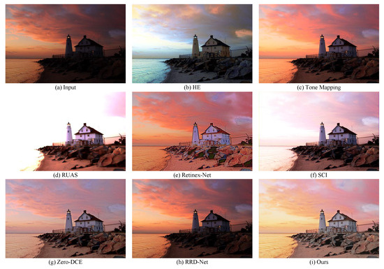 To comprehensively evaluate various algorithms, we also selected two unpaired benchmarks (LIME, MEF) for the verification experiments. As shown in Figure 9 and Figure 10, we show the visual contrast effects produced via these cutting-edge methods under various benchmarks. From these enhancement results, it is evident that HE greatly improves the contrast of the image, but there is also a significant color shift phenomenon. Retinex-Net introduces visually unsatisfactory artifacts and noise. Tone mapping and RRD-Net can preserve image details, but the overall enhancement strength is not significant, and they fail to effectively enhance local dark areas. RUAS and SCI can effectively enhance low-contrast images, but during the enhancement process, they tend to excessively enhance originally bright areas, such as the sky and clouds in Figure 10, which are replaced by an overly enhanced white-ish tone. Among all the methods, Zero-DCE and our proposed method perform well on these two benchmarks, effectively enhancing image contrast while maintaining color balance and detail clarity.