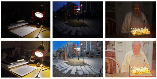 Visual comparison examples of non-uniform illumination images. The top images represent the input, while the bottom images depict the model’s output. In particular, within the red rectangles, the light sources are not excessively enhanced.