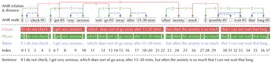 To prove our claim, we demonstrate the AMR graph of a sentence from the AMR 2.0 dataset (https://catalog.ldc.upenn.edu/LDC2017T10, accessed on 11 June 2022) and distinguish the AMR relation distances in terms of different segment levels (clause/phrase/token) in Figure 1. Every AMR relation is represented as a dependent edge between two abstract AMR nodes that align to one or more input tokens. The dependency distances of inter-token relations are subtractive results from the indices of tokens aligned to the source and target nodes, while those of inter-phrase and inter-clause relations are calculated by indices of the headwords in phrases and the verbs in clauses, respectively. (The AMR relation distances between a main clause and a relative/appositive clause are decided by the modified noun phrase in the former and the verb in the latter). As can be observed: