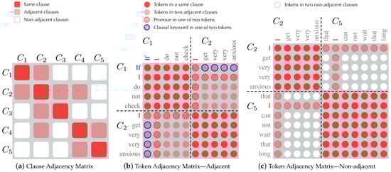 Overview of our hierarchical clause annotation (HCA)-based self-attention approach that integrates the clausal structure of input sentences. In (a), red blocks mean that clauses have the strongest correlation with themselves; the pink/white ones mean that the corresponding two are adjacent/non-adjacent in the HCA tree. In (b,c), the adjacency between two clauses is concretized in a token visibility matrix. Pink circles with a red dotted border mean one of the two corresponding tokens is a pronoun, while those with a blue solid border indicate the existence of a clausal keyword (i.e., coordinator, subordinator, or antecedent).