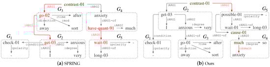 For SPRING, it mislabels node “go-02” in subgraph as the :ARG1 role of node “contrast-01”. Then, it fails to realize that it is “anxious” in that takes the :ARG1 role of “go-02” in . Additionally, the causality between and is not interpreted correctly due to the absence of node “cause-01” and its arguments.