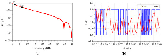 Signal integrity problem: (a) frequency response of the transmission channel; (b) ideal signal vs. infect signal.