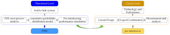 To achieve our objectives, we propose and implement a high-speed high-depth pre-interleaver of symbol pre-interleave bit muxing (PBM) to mitigate DFE error propagation. The theoretical level focuses on developing a cumulative probability distribution model to theoretically analyze the error probability and interleaving gain of PBM [15]. Due to the compensate constraint, the model is subject to a limit to the SerDes configuration with DFE. The circuit level aims to optimize the parallel pseudo-random binary sequence (PRBS) generator and memory of the pre-interleaver with 65 nm CMOS technology, increasing the transmission data rate and error discretization. This includes characteristic polynomial parallelization, the logic expansion method, and register-based memory with ping-pong interleaving technology. The circuit level incorporates basic optimizable methods among the interconnections, such as reducing fanout and transmission latency, to ensure the application of the 400 Gb/s Ethernet physical layer. The research framework of the pre-interleaver is illustrated in Figure 3.