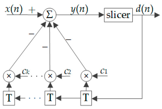 Figure 4 provides the structure of the DFE [16] and also illustrates the process of DFE error propagation [17]. The DFE consists of a summer, a slicer, several multipliers and several delay elements. x(n) and y(n) represent the input and output signal of DFE at the n-th period, respectively. d(n − i) represents the decision data in the delay element through i periods from the slicer. ci represents the coefficient of the i-th tap. Therefore, the propagation process can be expressed as [17]: