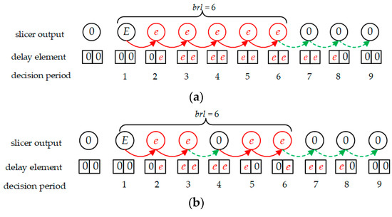 One case is continuous propagation, shown in Figure 5a. Although there are still errors in the delay elements in the 7th and 8th periods because the decision in the 6th period is wrong, there are no errors in the slicer after the 7th period. The error propagation caused by the initial random error E is indicated to be able to stop in the 7th period, in which brl is recorded as 6. Another case is the discontinuous one, shown in Figure 5b. It can be seen that, although DFE can make a correct decision in the 4th period, the errors in decision data in the 5th and 6th periods also occur because of some errors in the delay elements. In this case, brl is still 6.