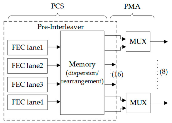 Figure 6 presents the pre-interleaving architecture in the Ethernet physical layer, including four FEC coders and one memory in the PCS, as well as eight multiplexers (MUX) [18] in the physical medium attachment (PMA). Memory can receive FEC coding data from four parallel FEC lanes to interleave these data. Then, these interleaved data are aggregated through the multiplexer to further discrete errors and double the transmission rate.