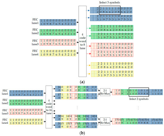 For non-interleaving scheme, every 16 FEC symbols from a selected FEC lane are distributed into two sub-lanes in a round-robin manner, and then they are directly transmitted through PMA without MUX. The disadvantage of this scheme is bits for every sub-lanes come from the same FEC lane, and this can result in reductions in error discretization. This problem can be addressed by another scheme, e.g., PBM. After selecting the FEC lane in a round-robin manner, every 16 FEC symbols from a selected FEC lane are distributed into 16 sub-lanes, and then 2 bits forming 2 sub-lanes are multiplexed in the MUX. Comparing these from the perspective of mitigating errors, assume that a seven-bit burst error occurs around the boundary of two symbols (see Figure 7a,b); these errors affect 3 symbols in an FEC lane for the non-interleaving scheme, but they only affect 2 symbols for the PBM scheme. It can be proved that PBM is more able to form discrete errors than the non-interleaving system.