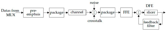 Before accurately estimating the effect of PBM on DFE error propagation, a SerDes link with some impairments, such as Gaussian noise, package and crosstalk, is constructed in Figure 8. In the SerDes link, some equalizers, e.g., pre-emphasis, are modeled to receive data from the MUX of PBM in Figure 7, and then a five-tap DFE combined with a dedicated FFE is adopted.